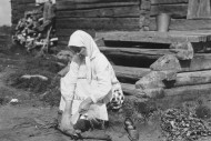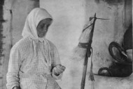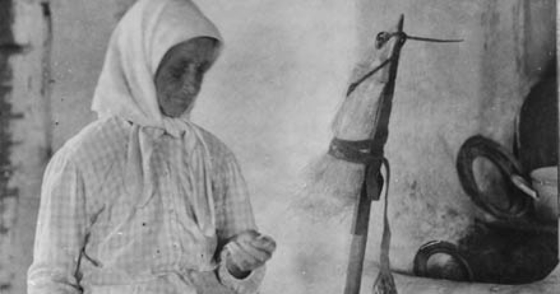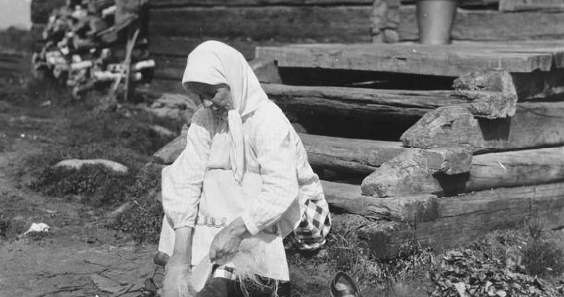 Kuvissa Marppa Vornanen, vidoo ja kehrää kuosalilla (”kuolsapeätä vadvoo”) Korpiselän Pesinniemessä 1929. Korpiselkä jäi rajan taakse 1945.